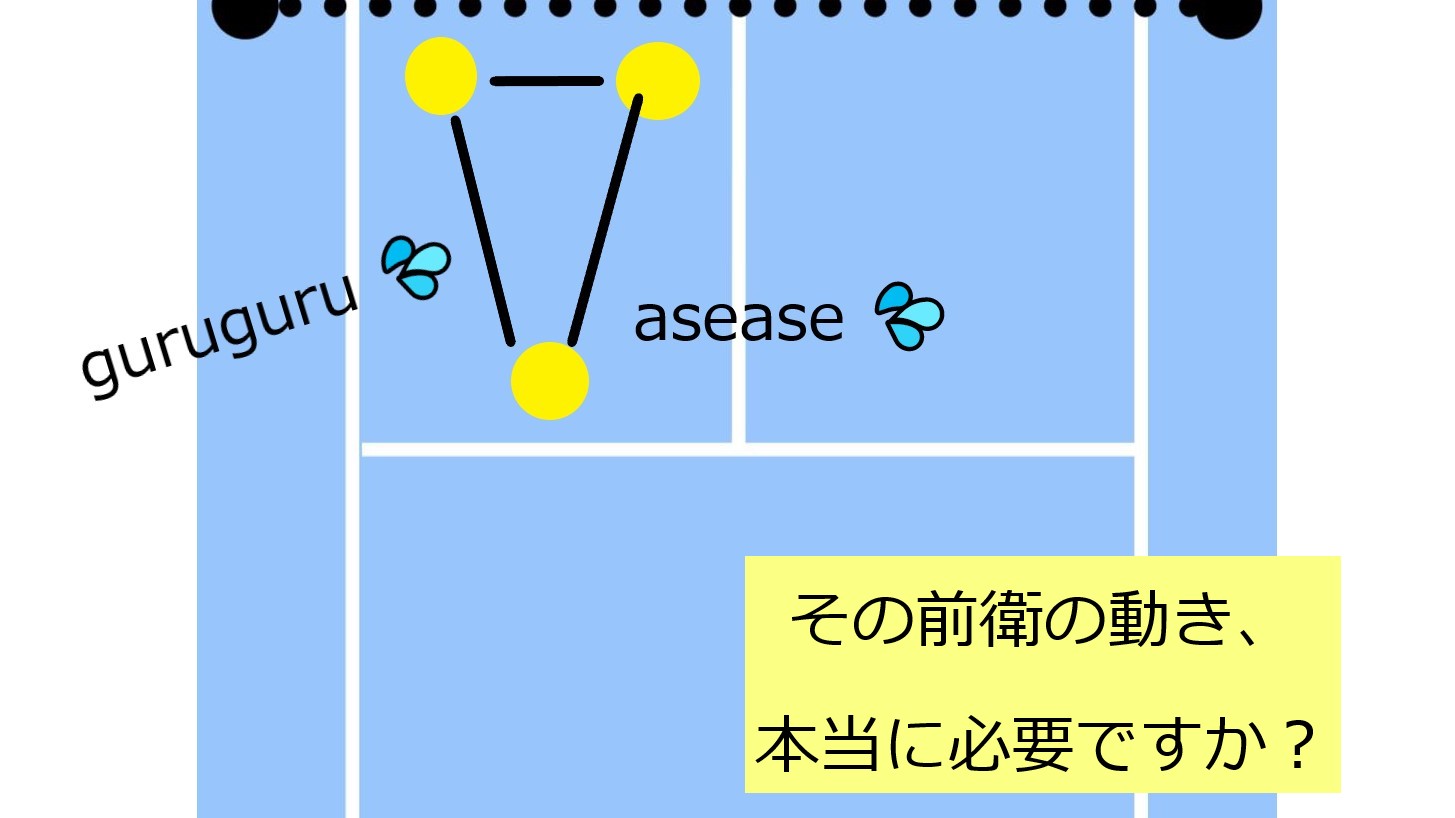 雁行陣前衛の基本の動きとされる三角ぐるぐるには、先ほどの「サービスキープ」同様、後衛のショットが、相手を「押す」という大前提があります。後衛同士のラリーがお互いに相手を「押して」「押されて」必ずそのリズムで早いうちにチャンスが来るという前提です。